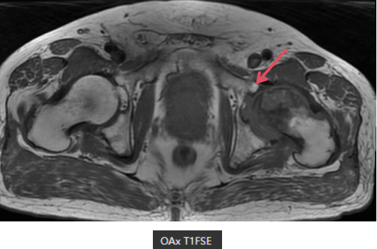 左侧股骨头变扁,局部塌陷,骨质内见线状T1WI低信号,髋臼及股骨近端骨松质见片状T1WI低、T2WI压脂高信号,DWI高信号,周围滑膜增厚,邻近软组织肿胀,PD压脂信号增高,关节腔少量积液。