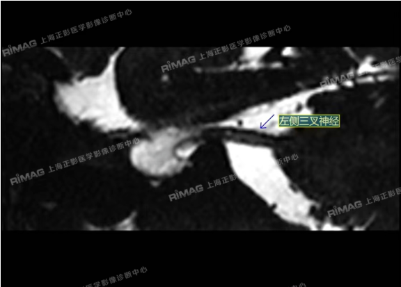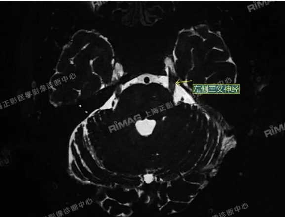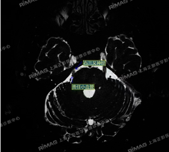 本例患者接受了MRTA(磁共振体层成像脑血管显影术)检查。这是一种非常精细的磁共振成像技术,能够清晰显示脑神经与周围血管的立体关系,尤其适用于三叉神经痛的病因诊断。