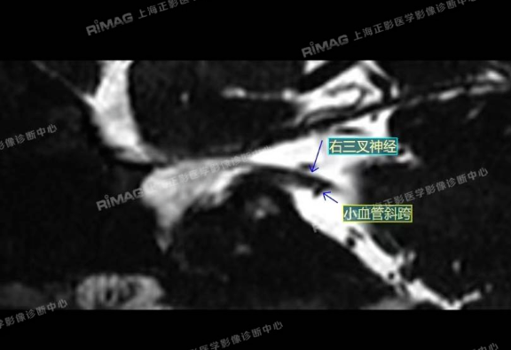 影像表现:右侧三叉神经根部外下方见小血管斜跨,与三叉神经分界不清;左侧未见明显异常(对照)。