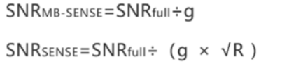 多层同时成像技术一般根据需要可以设置不同的加速倍数,该技术还可以结合磁共振快速采集技术,如普通并行采集技术、半扫描等。任何磁共振加速技术都会对原有的图像质量有影响,多层同时成像技术也不例外。使用了该技术之后,信噪比会有下降,但是和传统的并行采集技术相比,多层同时成像的优势在于信噪比降低不明显。下面两个公式是分别是多层同时成像的加速倍数及并行采集加速倍数和信噪比的关系。