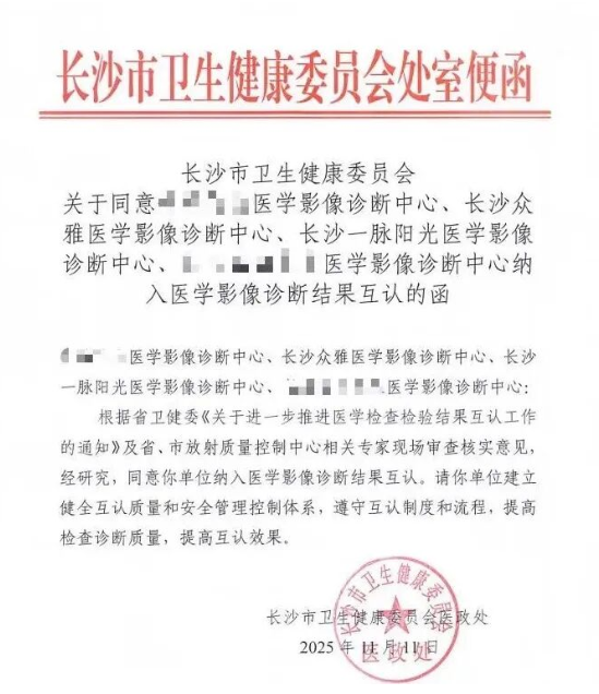 2025年11月11日,长沙市卫生健康委员会正式发文,同意将长沙一脉阳光医学影像诊断中心、长沙众雅医学影像诊断中心纳入医学影像诊断结果互认机构名单。这一决定,不仅标志着长沙中心、长沙众雅中心在影像质量、管理水平与服务能力上获得官方高度认可,更意味着长沙市民在就医过程中将迎来“一检通用、高效便捷”的影像服务新体验。