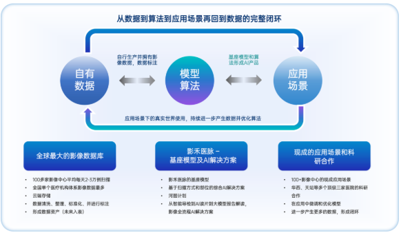 一脉阳光与影禾医脉的深度绑定,早已形成行业独有的发展优势。依托一脉阳光覆盖全国的百余家影像中心网络,双方沉淀了超4000万例高质量标准化影像数据资产,形成业内最大规模的真实世界影像数据库,为AI研发奠定了坚实基础。在此之上,影禾医脉成功自主训练出全球首个跨模态全流程的“影禾觅芽®”医学影像基座大模型,实现从X线、CT、MR到PET等多模态影像的统一理解与智能分析,该基座模型不仅支撑了“胸部CT平扫辅助诊断AIR”“冠状动脉CTA智能分析”等路径级AI产品落地,更通过“MIIA-iSpacs智慧影像系统”“MIIA-iData数据资产化平台”“MIIA-iResearch科研赋能平台”及“MIIA-AI工具部署平台”四大产品矩阵,为医院、影像中心及科研机构提供可复制、可迭代的AI赋能解决方案。模型能力反哺赋能影像中心后,核心优势在于实现了“数据驱动模型进化、模型赋能业务提升、业务再生优质数据”的自我强化闭环,这不仅提升了诊断效率与一致性,也为AI产品的持续优化提供了源源不断的燃料。